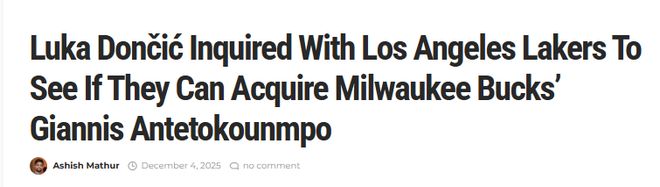 北京时间12月5日,据福克斯体育记者卢-卡内利斯透露,NBA超级球星卢卡-东契奇曾向洛杉矶湖人方面询问,球队是否有能力从密尔沃基雄鹿队交易得到字母哥。字母哥曾在休赛期表达了离队意愿,其第一心仪下家为纽约尼克斯。