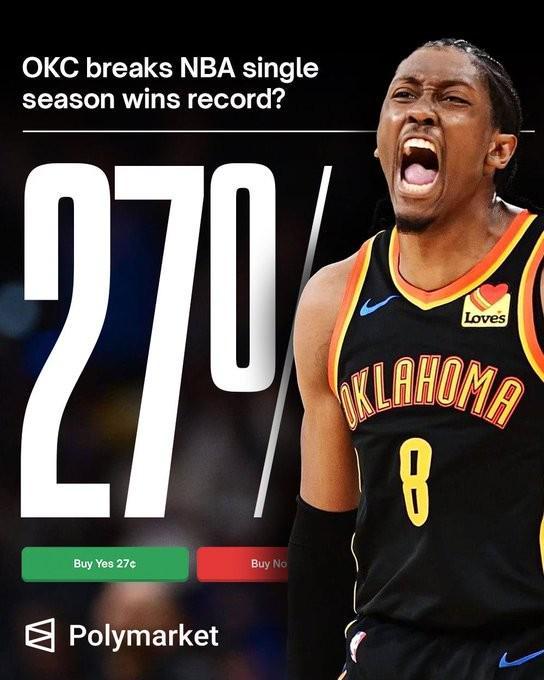 北京时间今日,据美国体育数据网站Polymarket的数据统计,雷霆队本赛季将有27%的概率打破勇士在2015-16赛季保持的常规赛73胜9负的最佳战绩。